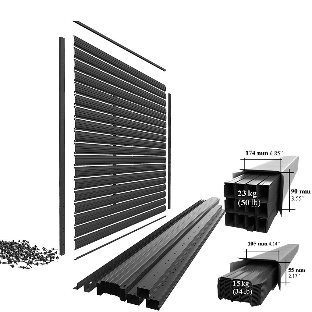- - Elongated holes perforated in the slats and in the horizontal support guarantee the flawless installation of the fence in case of deviation of the posts by up to 12 mm.
